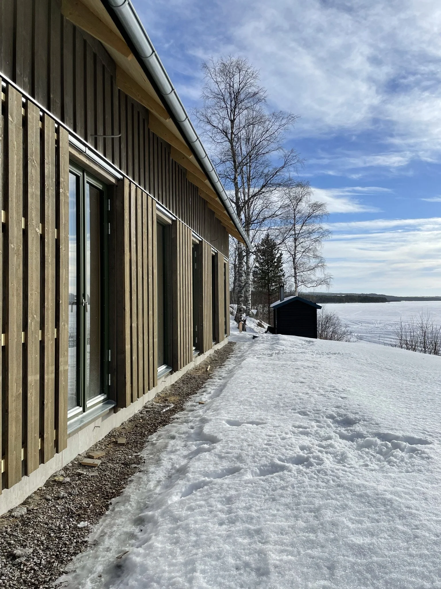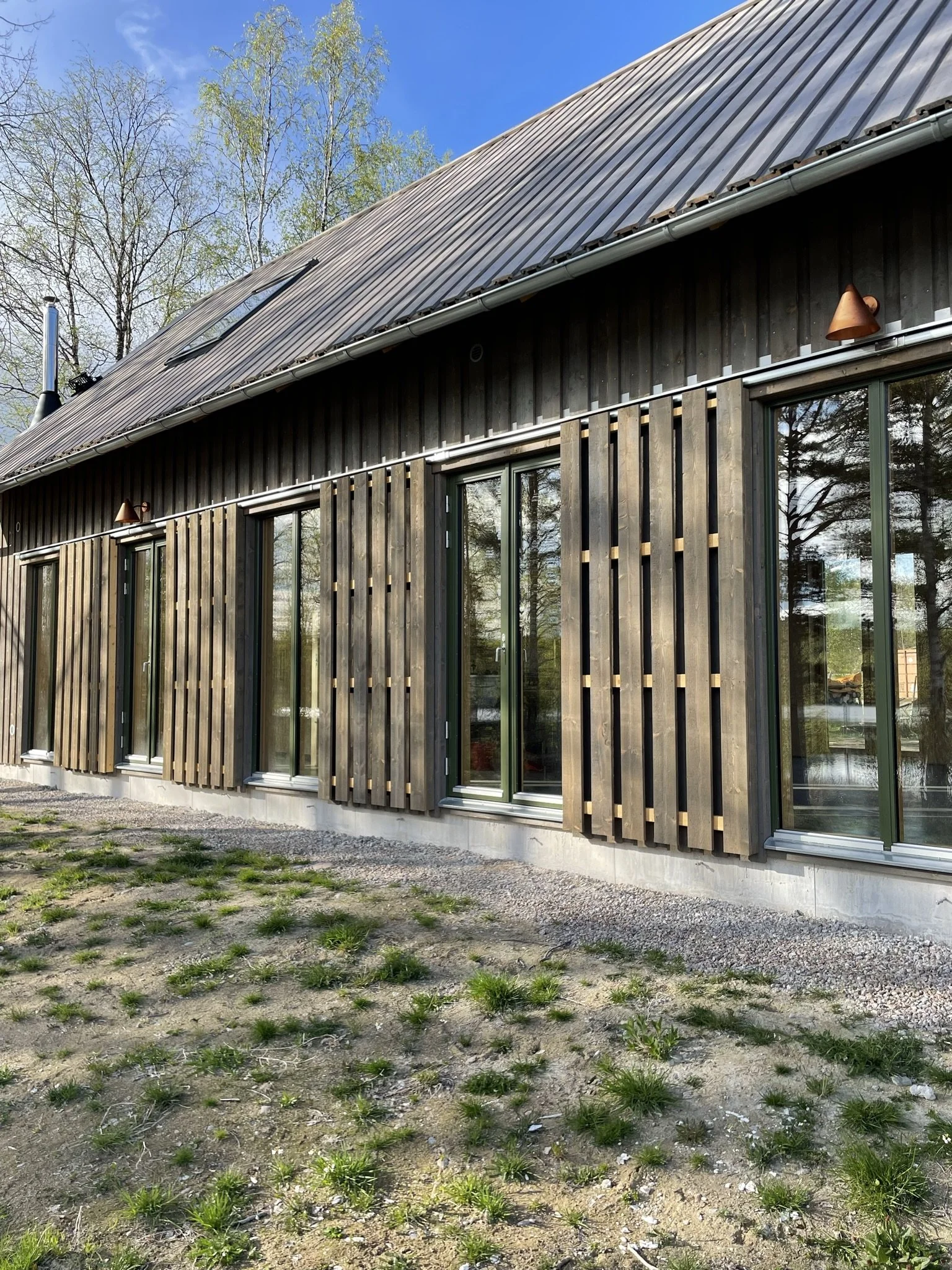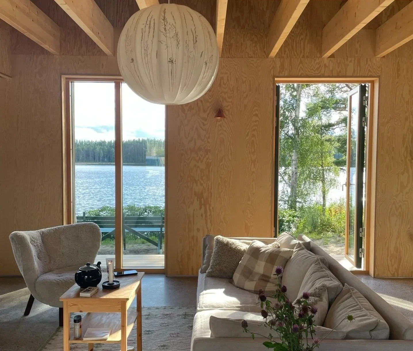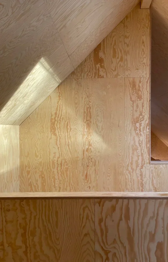 Husets placering mellan äng och sjö har inspirerat till bottenvåningens planlösning där den parallella fönstersättningen skapar utblick, genomsikt och genomgång. Furu och gran från landskapet har använts både exteriört och interiört, från faltak till synlig plywood som är genomgående i husets invändiga ytskikt.