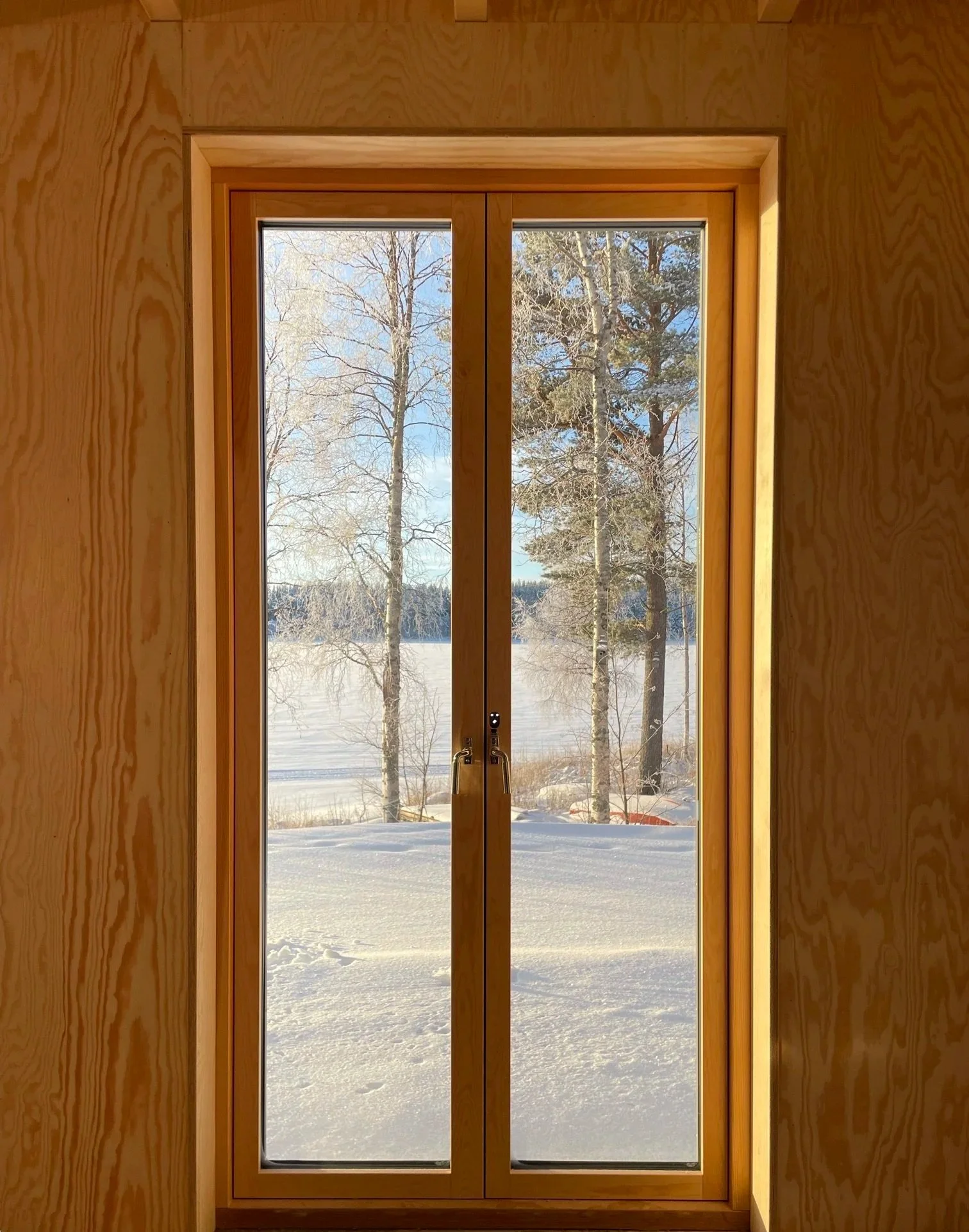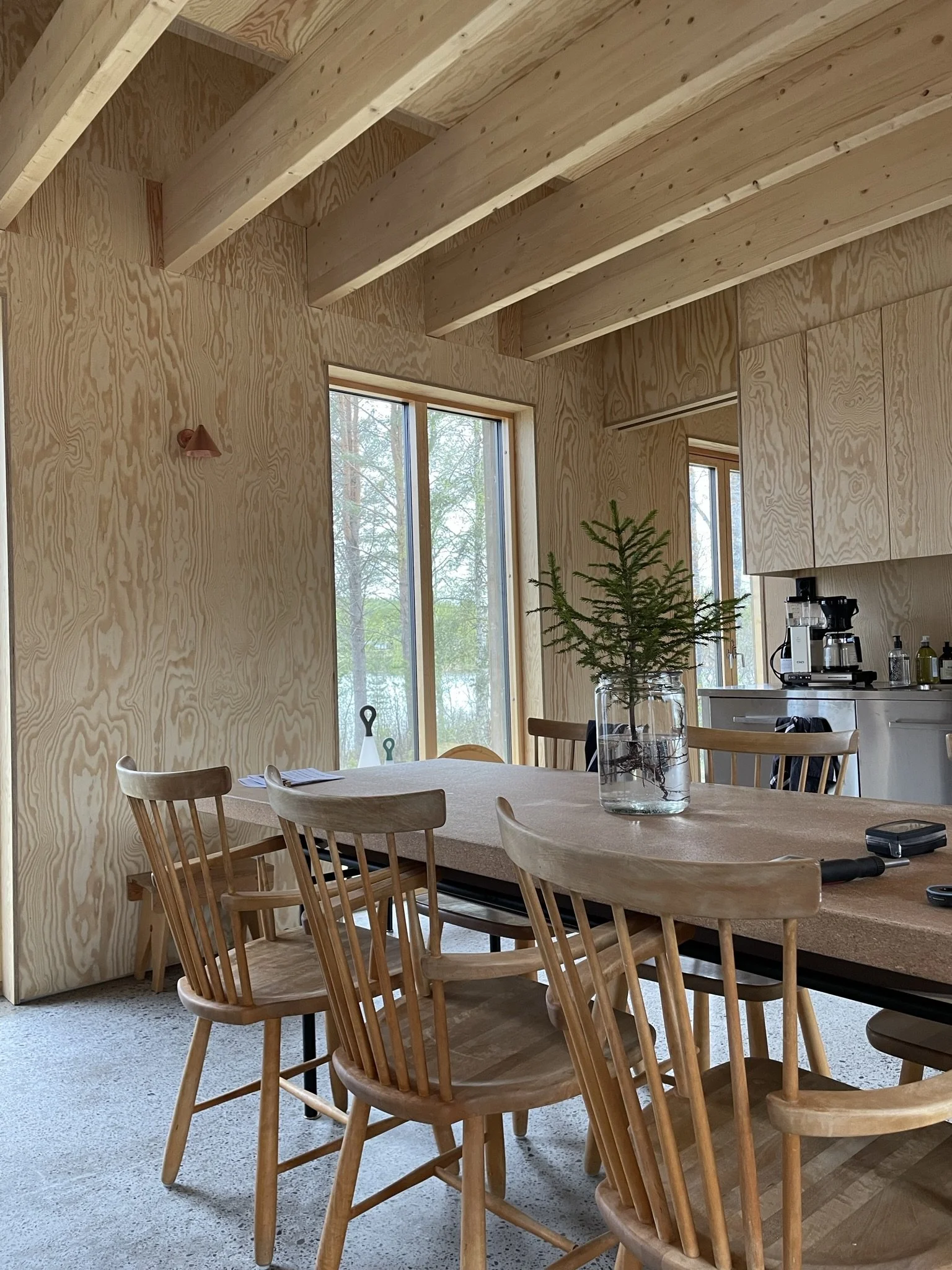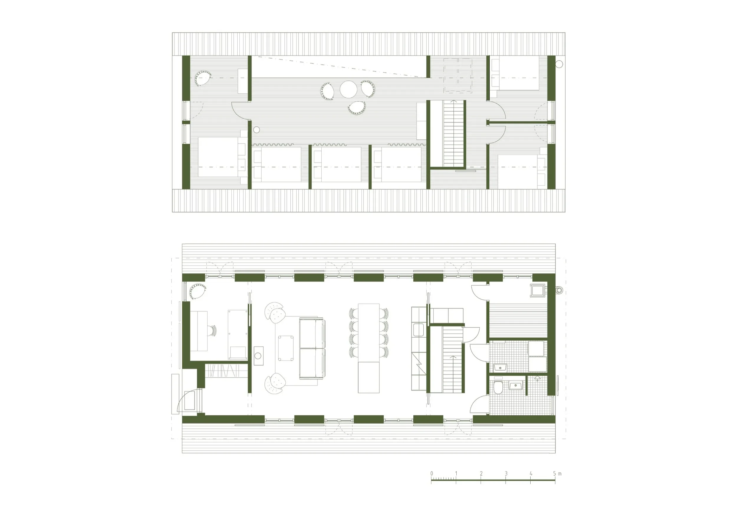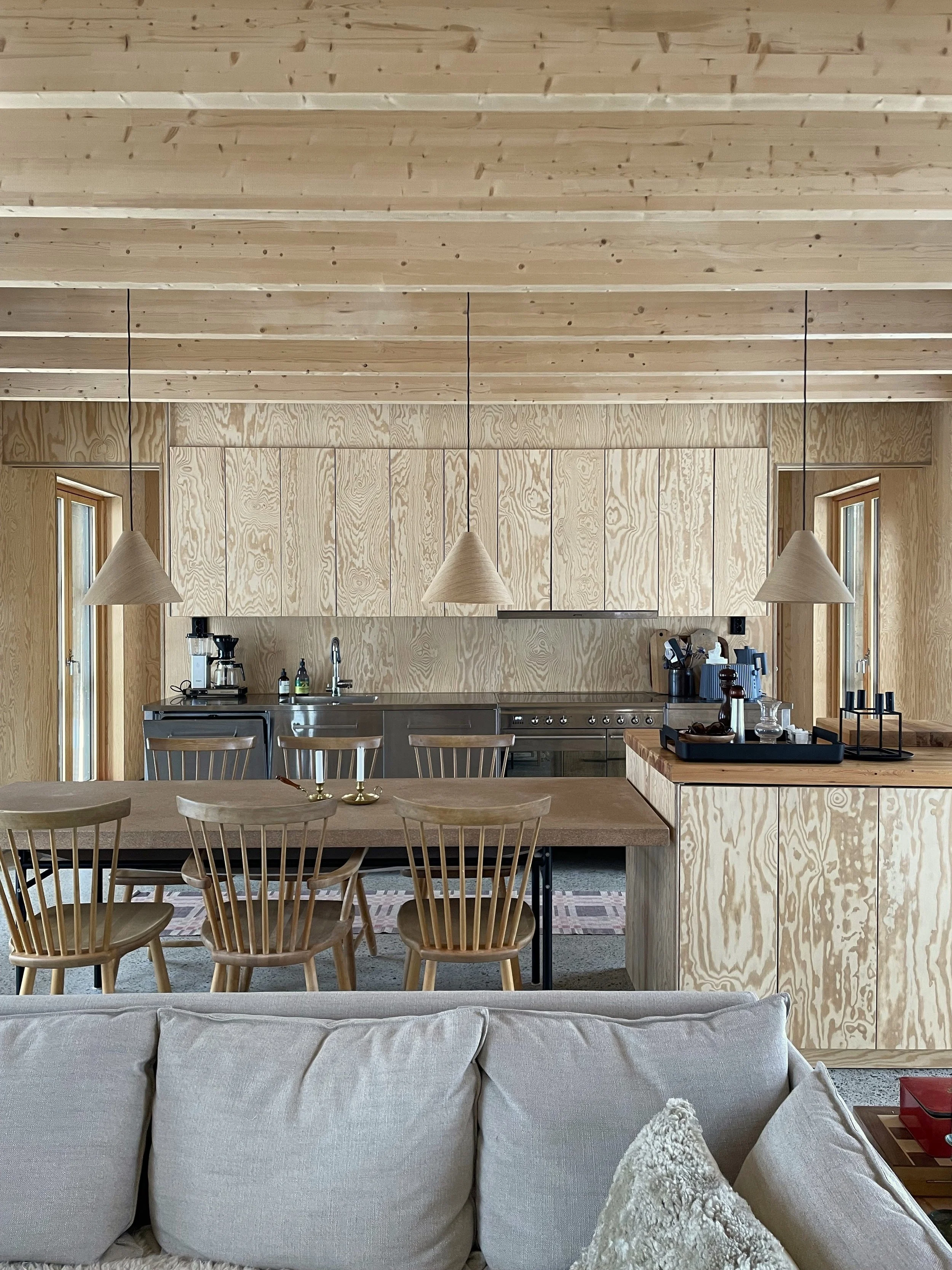 Husets placering mellan äng och sjö har inspirerat till bottenvåningens planlösning där den parallella fönstersättningen skapar utblick, genomsikt och genomgång. Furu och gran från landskapet har använts både exteriört och interiört, från faltak till synlig plywood som är genomgående i husets invändiga ytskikt.