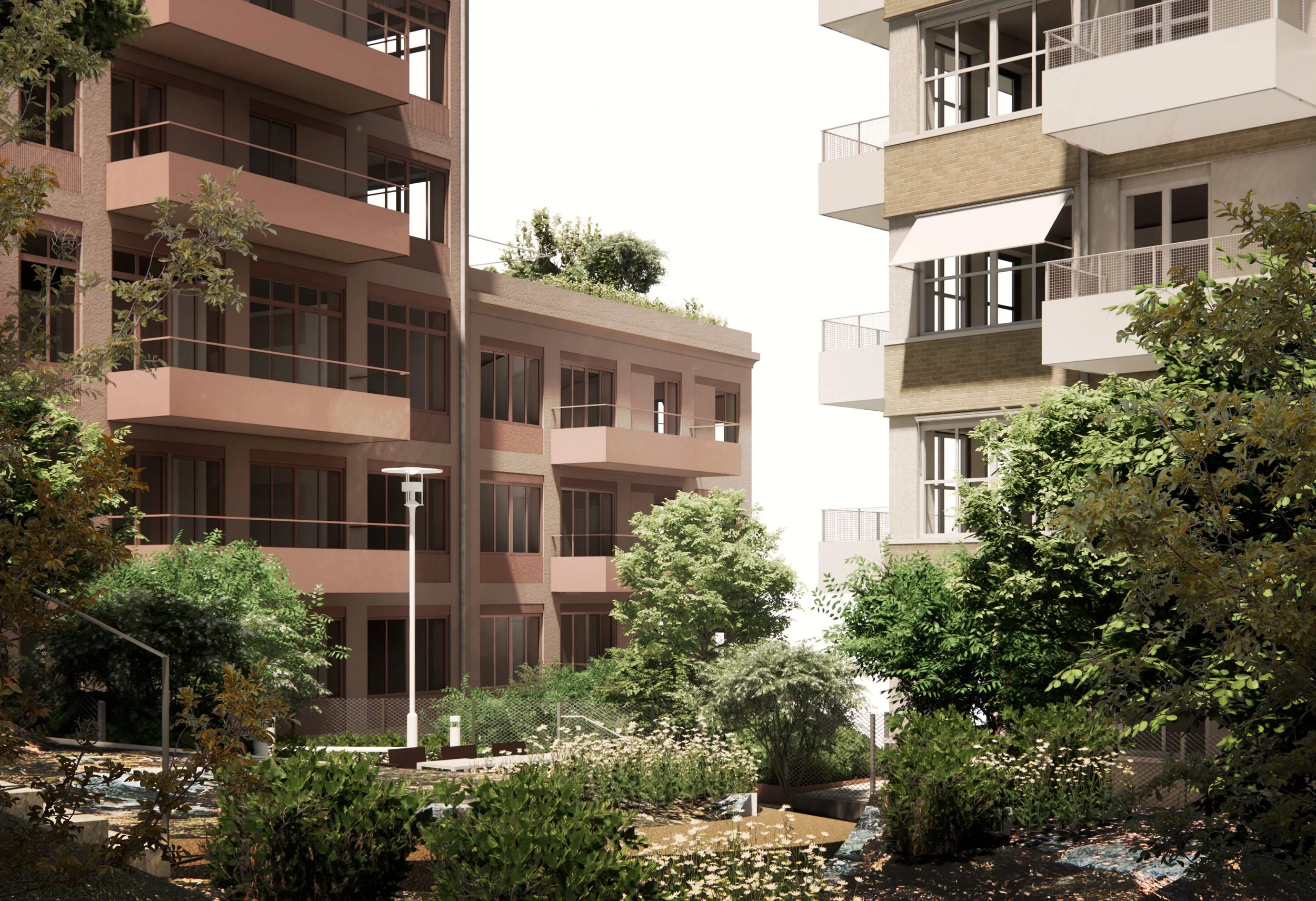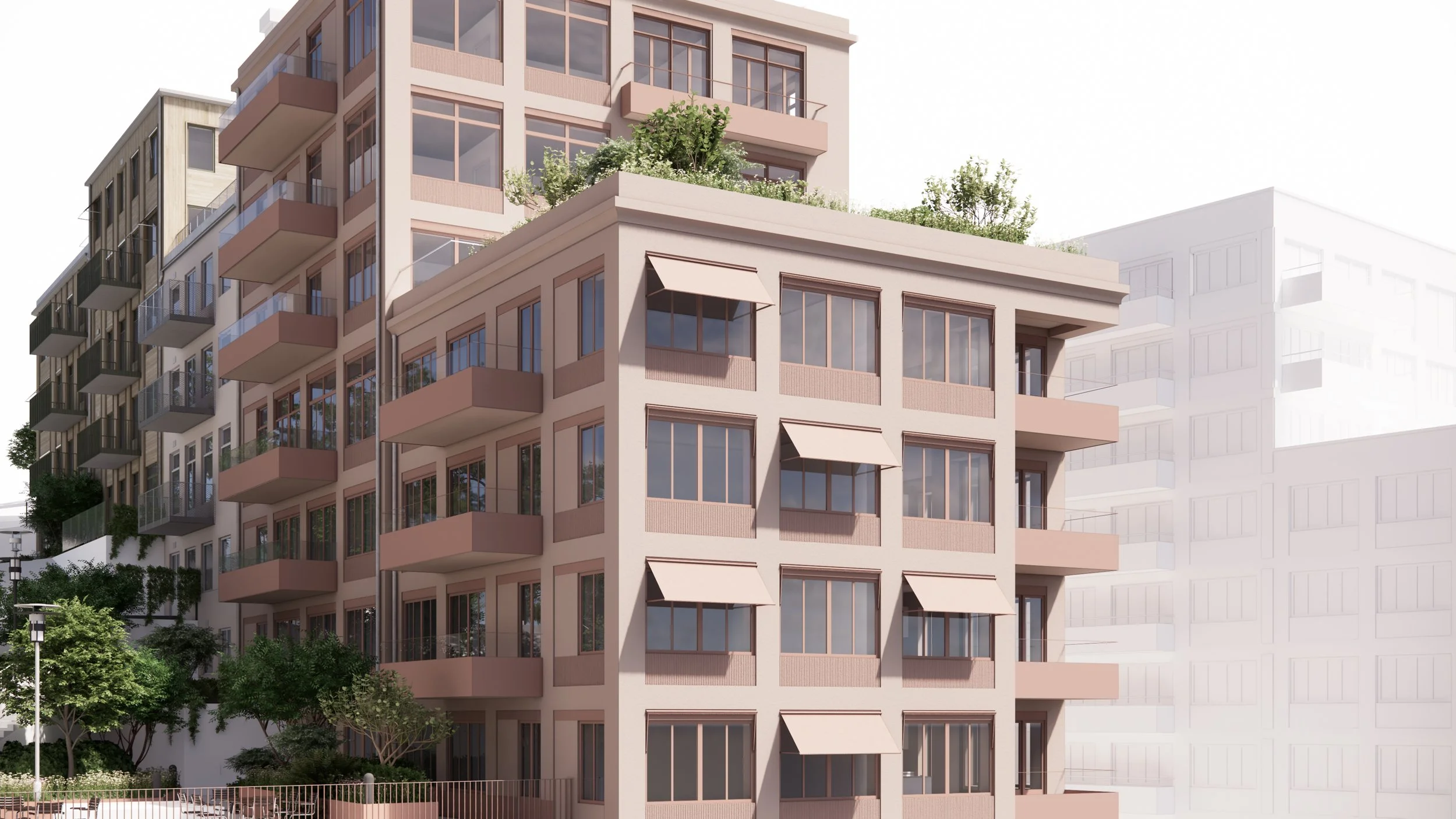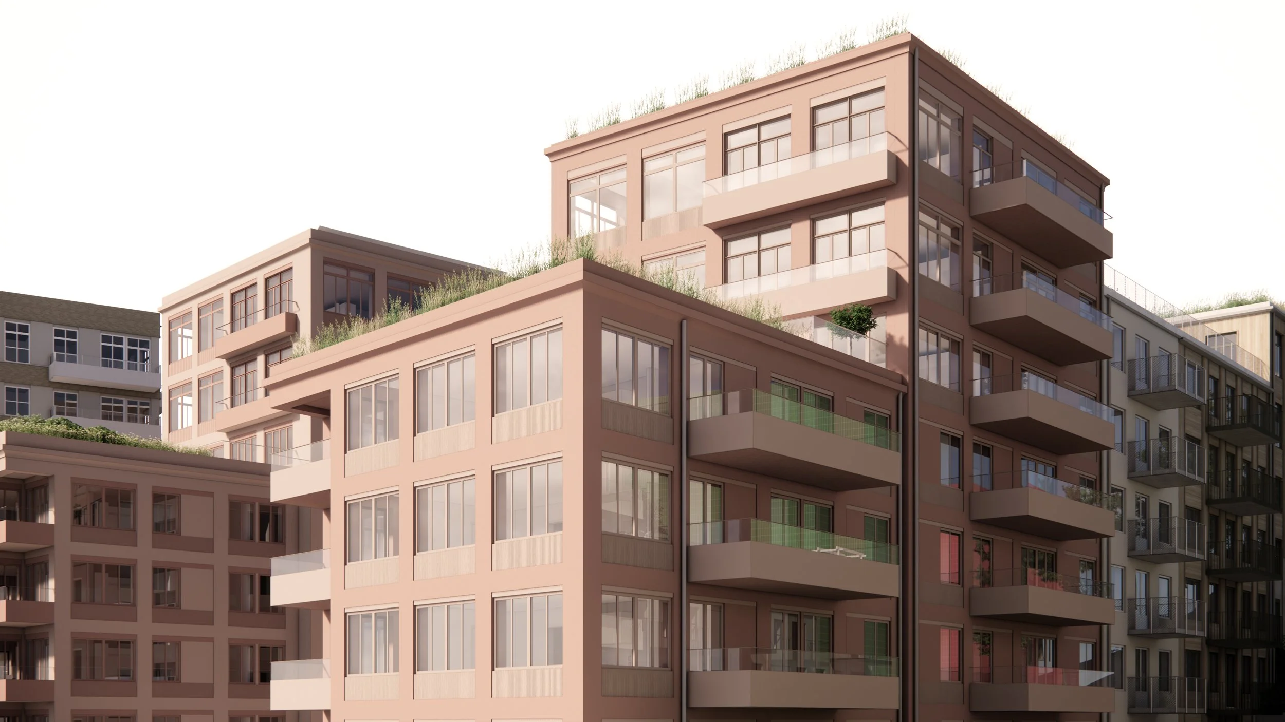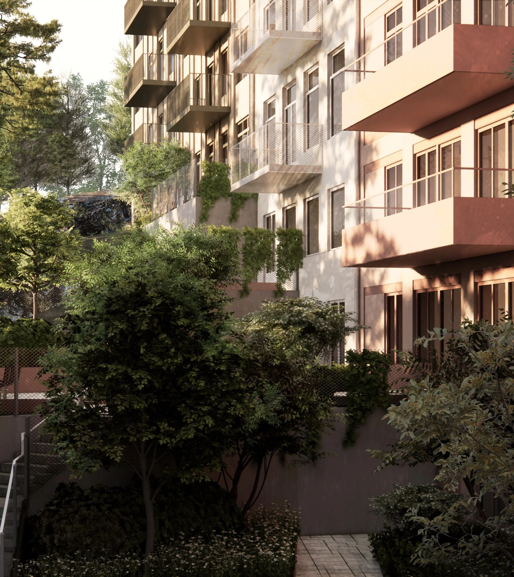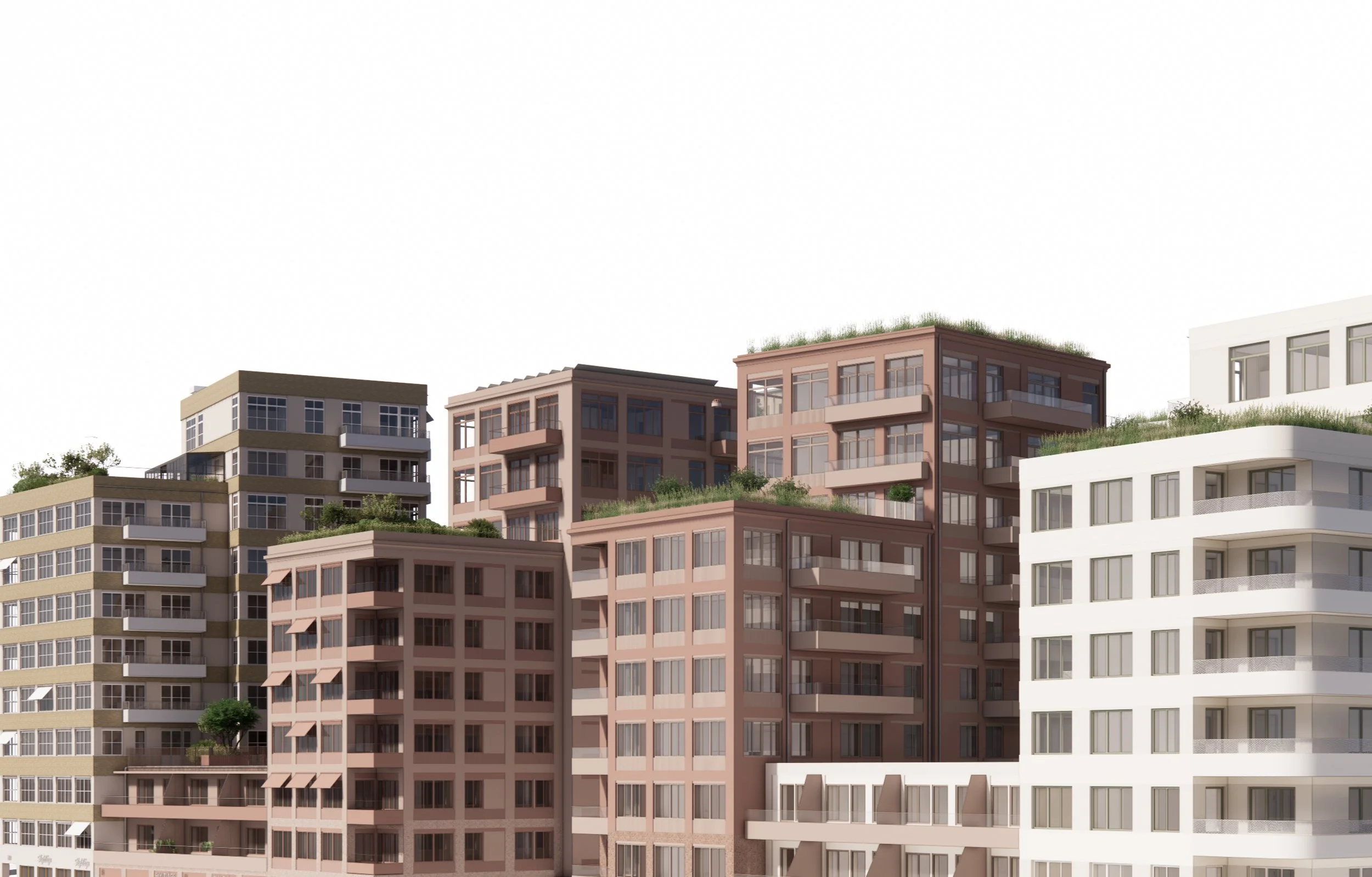 Bergsterrassens hus möter först stadsgata och torg innan de klättrar uppför berget mot tallskogen bakom. Läget ger att många av bostäderna har fantastiska utblickar över Stockholms inlopp, Djurgården och Nackas naturområden. Dessa förutsättningar har vi byggt vidare på och förvaltat när vi format byggnaderna och planerat bostäderna.